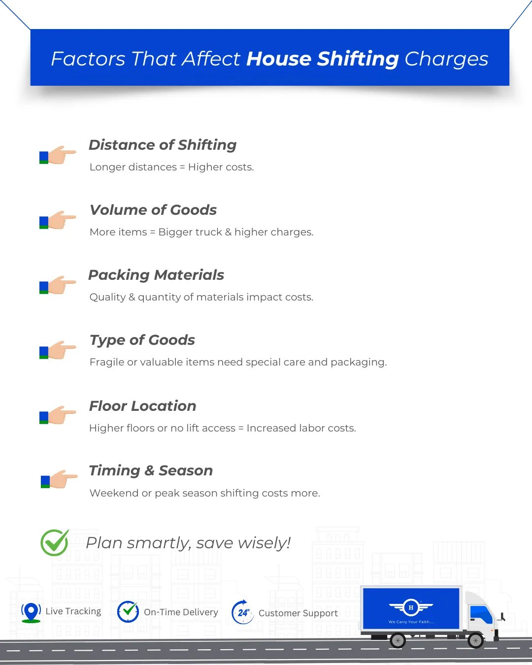 Intercity or Interstate Moves: Longer distances increase costs due to fuel, tolls, and time.